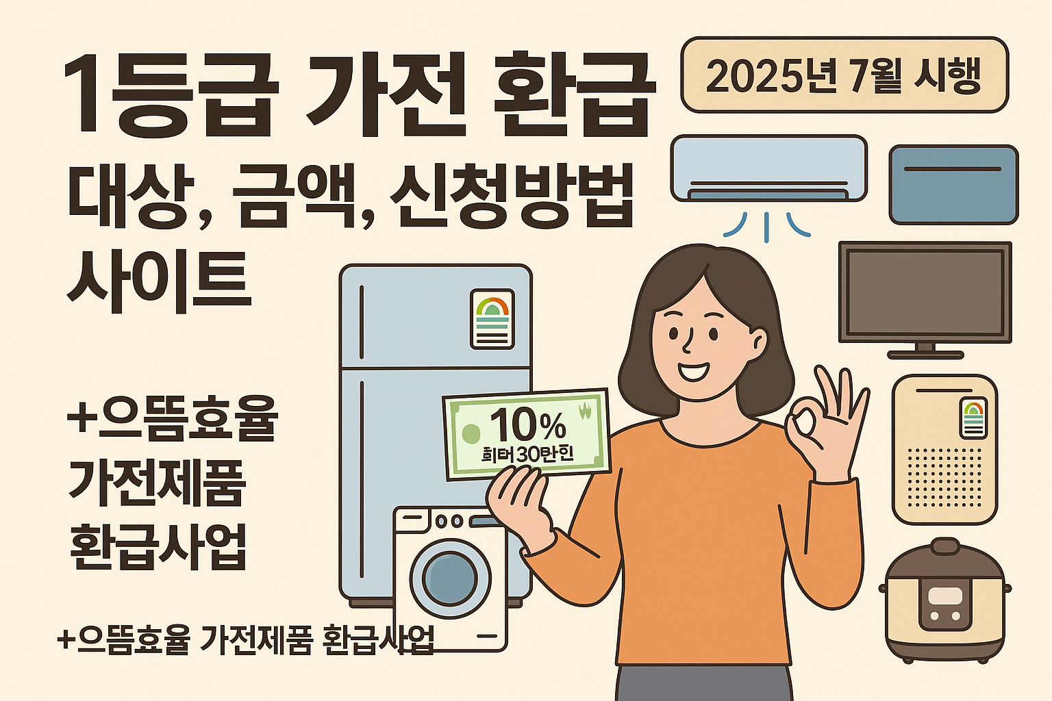 2025년 7월부터 시행되는 ‘으뜸효율 가전제품 환급사업’을 통해 에너지소비효율 1등급 가전 제품(진공청소기 2등급 포함)을 구매한 만 19세 이상 개인에게 구매 금액의 10%, 최대 30만 원까지 환급해주는 정책으로, 대상 품목·환급 금액·신청 절차·환급 사이트를 상세하게 설명합니다.