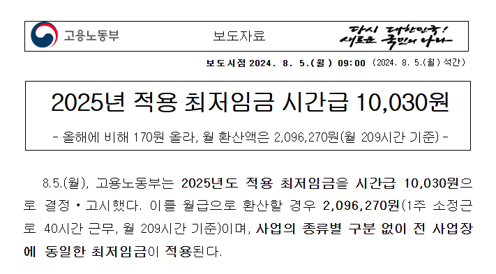 2025년 최저임금 관련 고용노동부의 보도자료를 확인하고 싶으신 경우 아래 링크를 참고하시기 바랍니다.