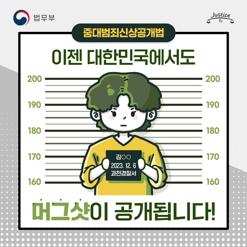 법무부에 의하면 이젠 대한민국에서도 머그샷이 공개된다고 합니다. 2024년 1월 25일부터 시행되는 중대범죄신상공개법에 따르면 신상공개 대상 범죄자의 최신 머그샷을 확인하실 수 있습니다. 기존에는 피의자의 동의 없이 머그샷을 공개하거나 얼굴 사진을 촬영할 수 없었지만, 이제는 피의자의 최근 모습을 공개하고, 머그샷 강제 촬영 및 공개가 가능해졌으며 신상정보 역시 30일 동안 공개할 수 있습니다. 자세한 내용은 아래 법무부 홈페이지를 참고하시기 바랍니다.