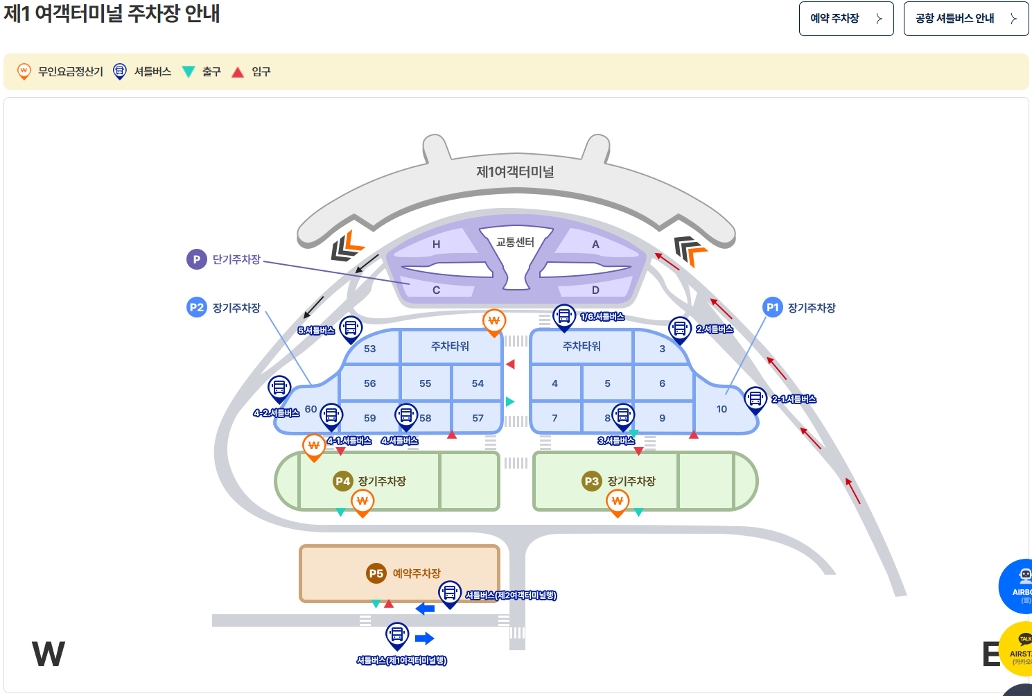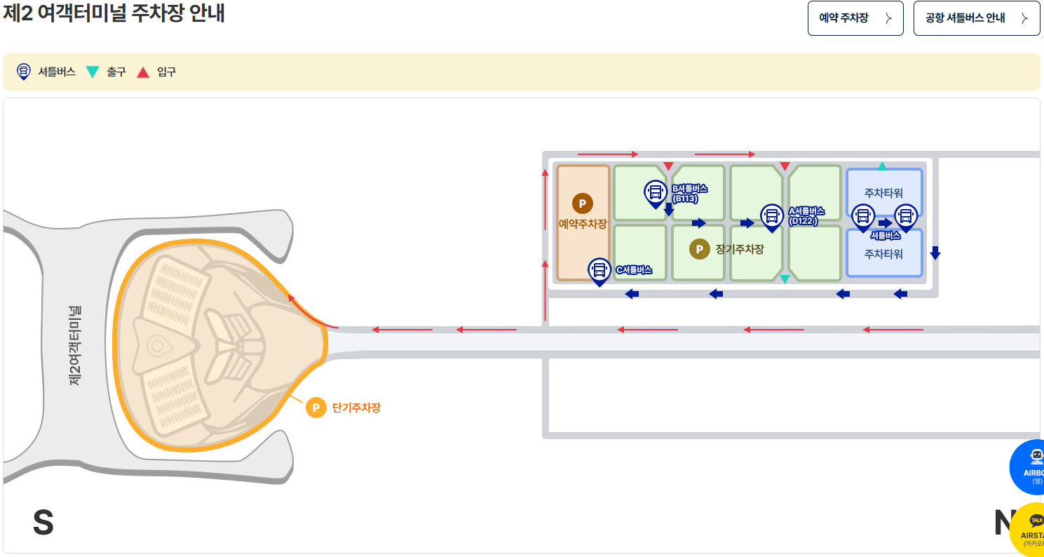 - 주차 후 가까운 셔틀버스 정류장에서 무료 셔틀버스를 이용해 터미널로 이동할 수 있습니다.
