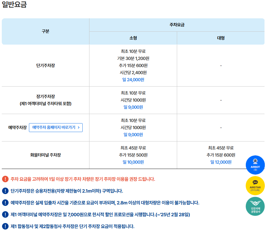 ※ 실제 요금은 인천국제공항 공식 웹사이트나 현장 안내를 통해 최신 정보를 확인하시기 바랍니다.