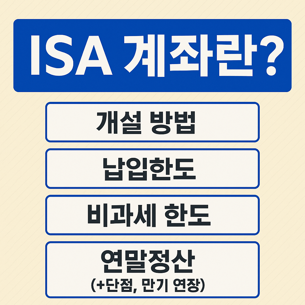 ISA(개인종합자산관리계좌)는 다양한 금융상품에 투자하면서 세제 혜택을 누릴 수 있는 통합 계좌입니다. 2025년에는 ISA 제도가 개편되어 납입 한도와 비과세 한도가 확대되고, 만기 연장 및 연말정산 혜택도 강화되었습니다. 아래에서 ISA 계좌의 개념부터 개설 방법, 납입 한도, 비과세 한도, 연말정산 혜택, 단점, 만기 연장 방법까지 자세히 알아보겠습니다.