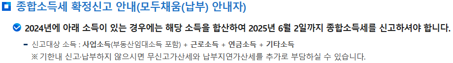 2024년에 다음과 같은 소득이 있는 경우, 2025년 6월 2일까지 종합소득세를 신고해야 하며, 국세청이 선별한 경우 모두채움 대상자로 포함됩니다.