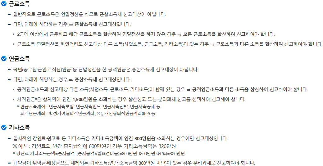 👉 연간 연금소득이 일정 금액 초과 시 신고 대상 - 기타소득자는 연간 기타소득이 300만 원 초과 시 종합과세로 반드시 신고