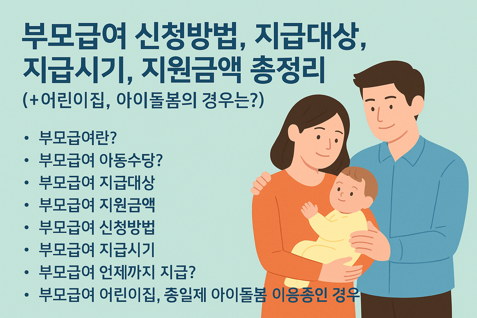 육아는 사랑이지만, 동시에 막대한 시간과 비용이 들어가는 일입니다. 정부는 만 0~1세 영아를 양육하는 가정을 위해 부모급여 제도를 시행하고 있으며, 2025년 기준 최대 월 100만 원의 지원을 받을 수 있습니다. 본 글에서는 지급대상부터 신청방법, 어린이집 및 아이돌봄 서비스 이용 시 주의사항까지 모두 정리해드립니다.